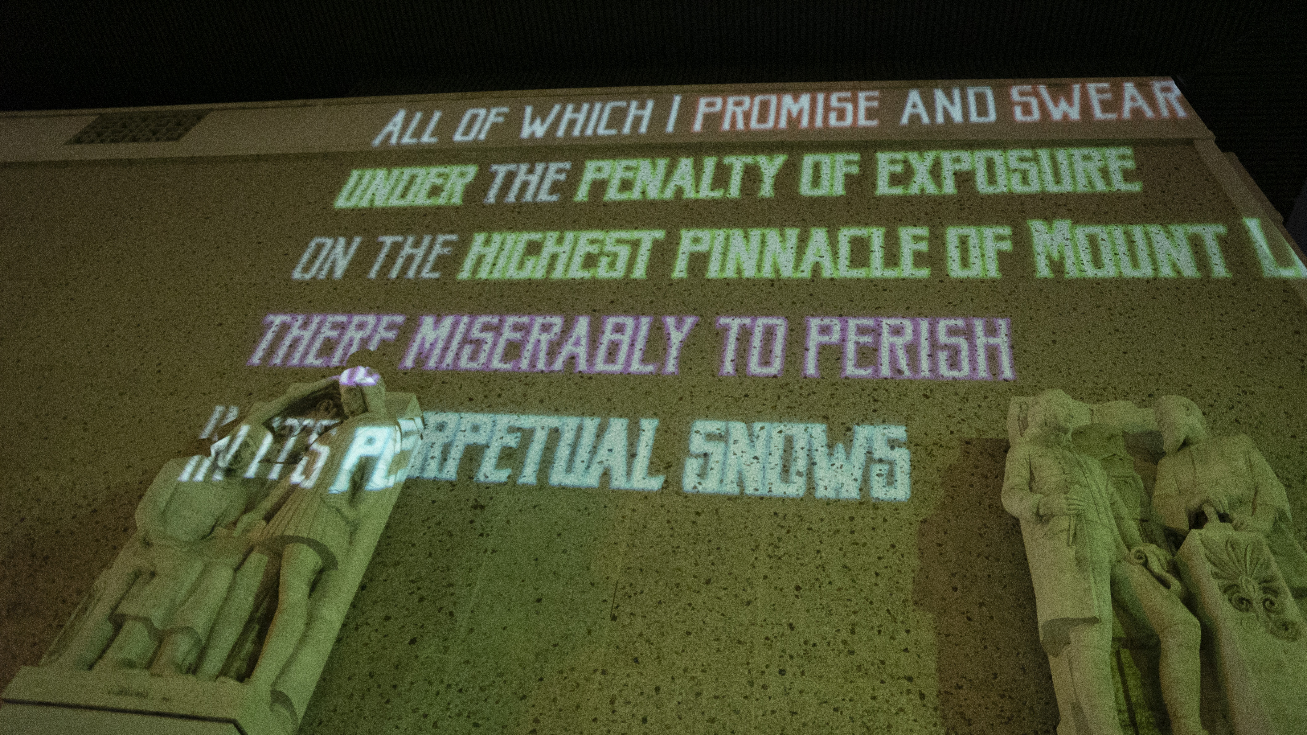 I projected salient excerpts of a Scottish Rite Masonic initiation oath on the Wilshire-facing exterior of the MAF, a private museum located in a former Scottish Rite Temple in the Hancock Park neighborhood of Los Angeles.